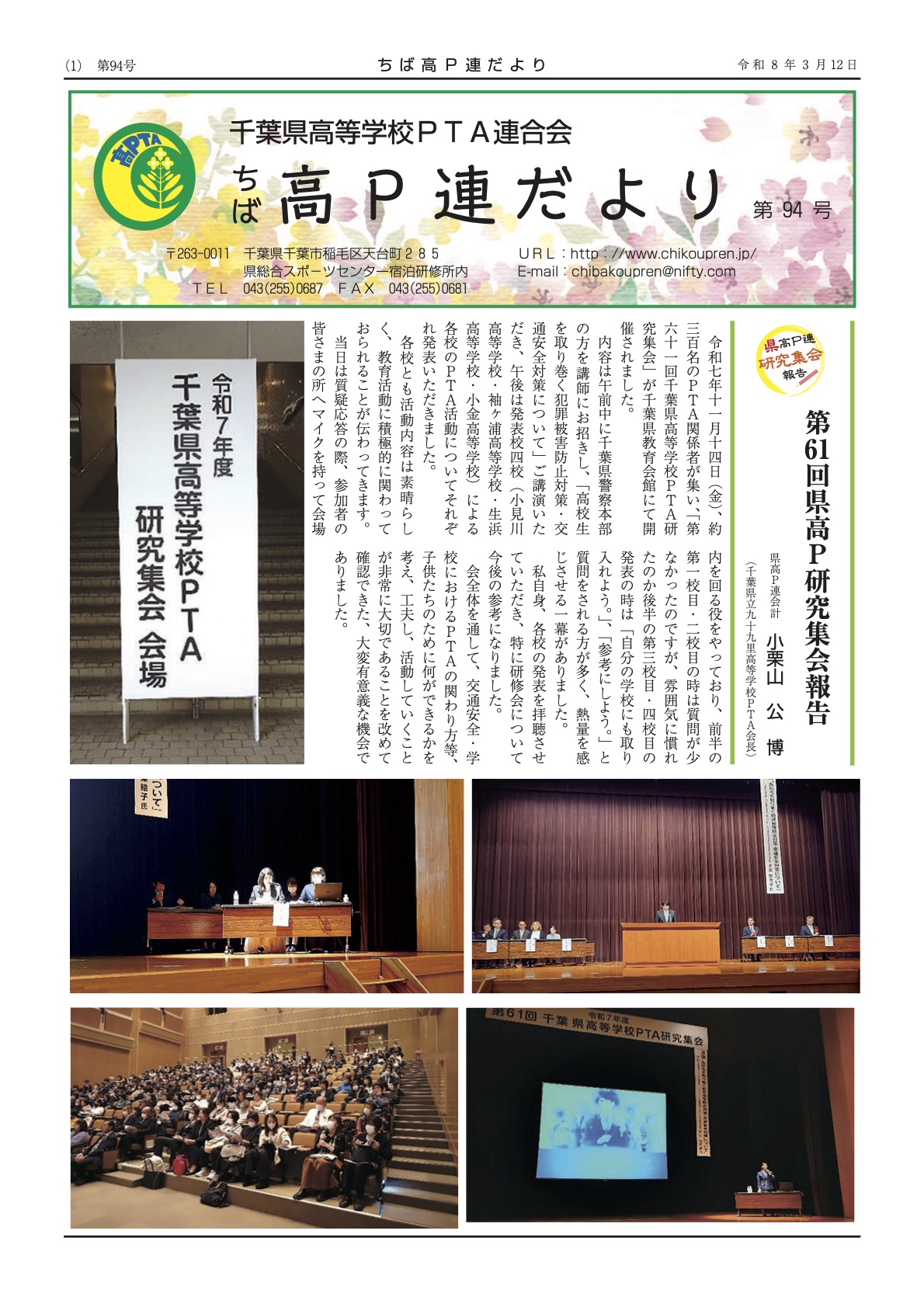ちば高P連だより (画像をクリックしてPDFをダウンロード) 第94号 2026年03月 バックナンバー (画像をクリックしてPDFをダウンロード) 第93号 2025年11月 第92号 2025年03月 第91号 2024年11月 第90号 2024年03月 第89号 2023年11月 第88号 2023年03月 第87号 2022年11月 第86号 2022年03月 第85号 2021年11月 第84号 2021年03月 第83号 2020年12月 第82号 2020年03月